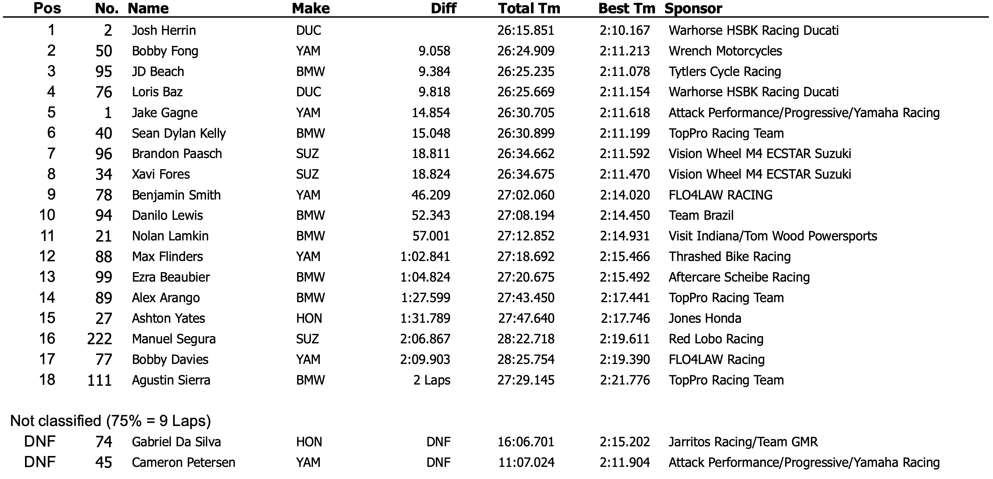 Le triple champion en titre, Jake Gagne, se classe cinquième. Un résultat qui n’est pas décevant dans l’ensemble, lorsqu’on sait le week-end qu’a traversé son rival au championnat, Cameron Beaubier. Après une lourde chute en Course 1, le poleman s’est fracturé le talon. Il n’a donc pas participé au reste du week-end.