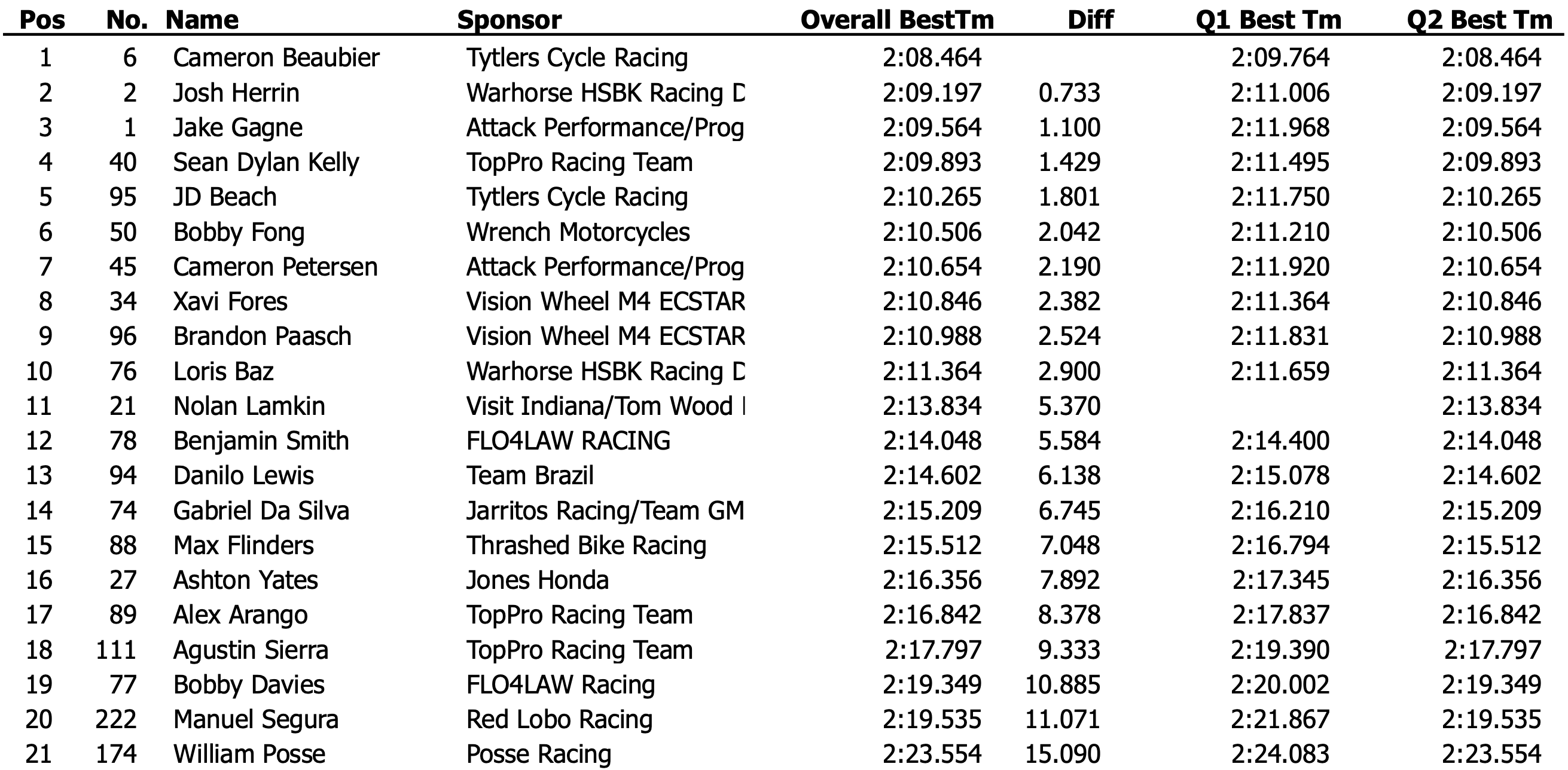 La précédente marque de référence avait été établie l’an dernier par Josh Herrin, en 2:08.795. Le pilote Ducati a d’ailleurs tenté de se défendre, et menait un temps la session avec un chrono en 2:09.197. Le pilote Warhorse Racing terminé finalement en deuxième position du classement combiné des deux séances qualificatives.