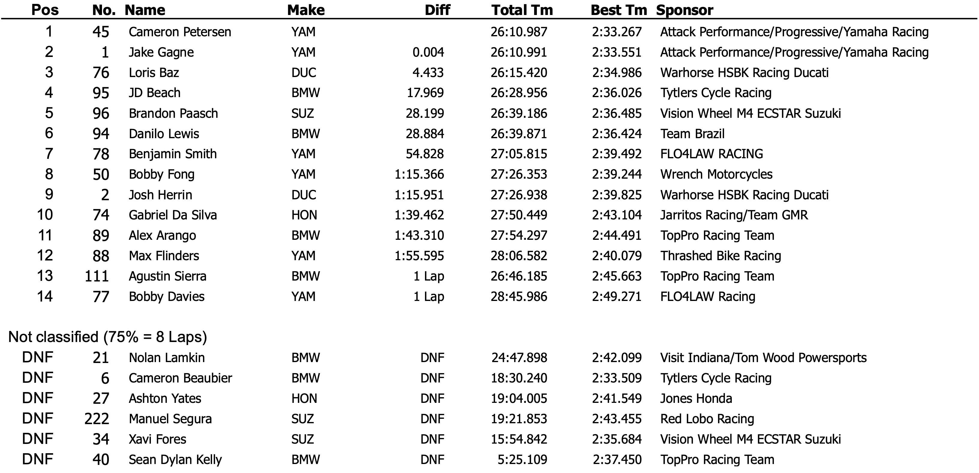 Un facteur qui a totalement rebattu les cartes, au désavantage de Cameron Beaubier. Parti en pole, celui qui a dominé toute la première partie de week-end a fait une première erreur qui a compromis ses chances de victoire. Revenant sur le peloton de tête avec un rythme infernal, tournant quasiment deux secondes plus vite au tour que les leaders, il a subi une seconde chute à deux tours de l’arrivée. Plus coûteuse cette fois puisqu’il fut emmené au centre médical en raison de douleurs à la jambe droite.
