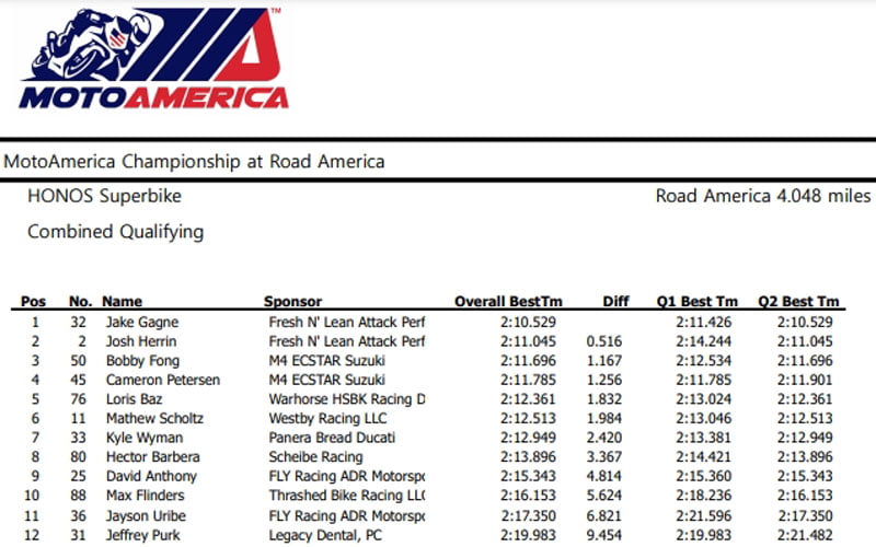Au terme des qualifications, on trouvait les deux pilotes Yamaha du Fresh N’ Lean Attack Performance Yamaha, Jake Gagne et Josh Herrin, devant les deux pilotes du team M4 ECSTAR Suzuki , Bobby Fong et Cameron Petersen.