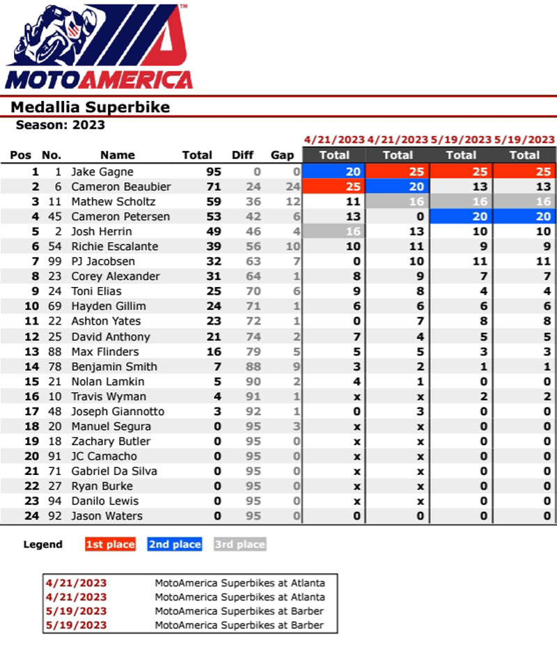 On attendait la suite au Barber Motorsports Park de Birmingham, en Alabama, pour la deuxième manche de la saison mais, heureusement pour lui et malheureusement pour nous, Jake Gagne n’y a pas vraiment eu d’adversaires en mesure de mettre à mal sa domination, et on se retrouve donc avec l’officiel Yamaha en tête du classement général, après trois victoires consécutives et avec une avance de 21 points au championnat.