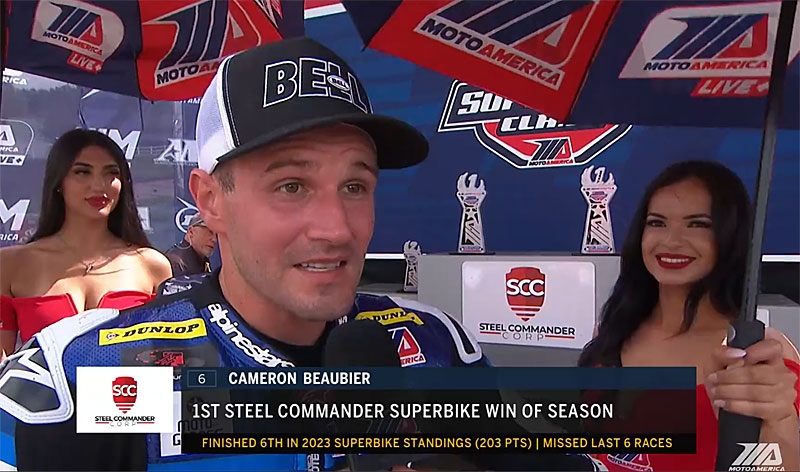 C’est d’ailleurs l’homme de Floride qui faisait le holeshot au départ des 19 tours, inaugurant une course extrêmement disputée comme le montre l’écart de 3 dixième entre les trois premiers, et de moins de 6 secondes entre les huit premiers. On vous épargne donc l’énumération des innombrables passes d’armes, pour citer le vainqueur, le quintuple champion Cameron Beaubier au guidon de sa BMW du Tytler Cycle Racing devant le triple champion en titre Jake Gagne (Attack Performance Yamaha), pour passer à ce qui s’est passé après la ligne d’arrivée.