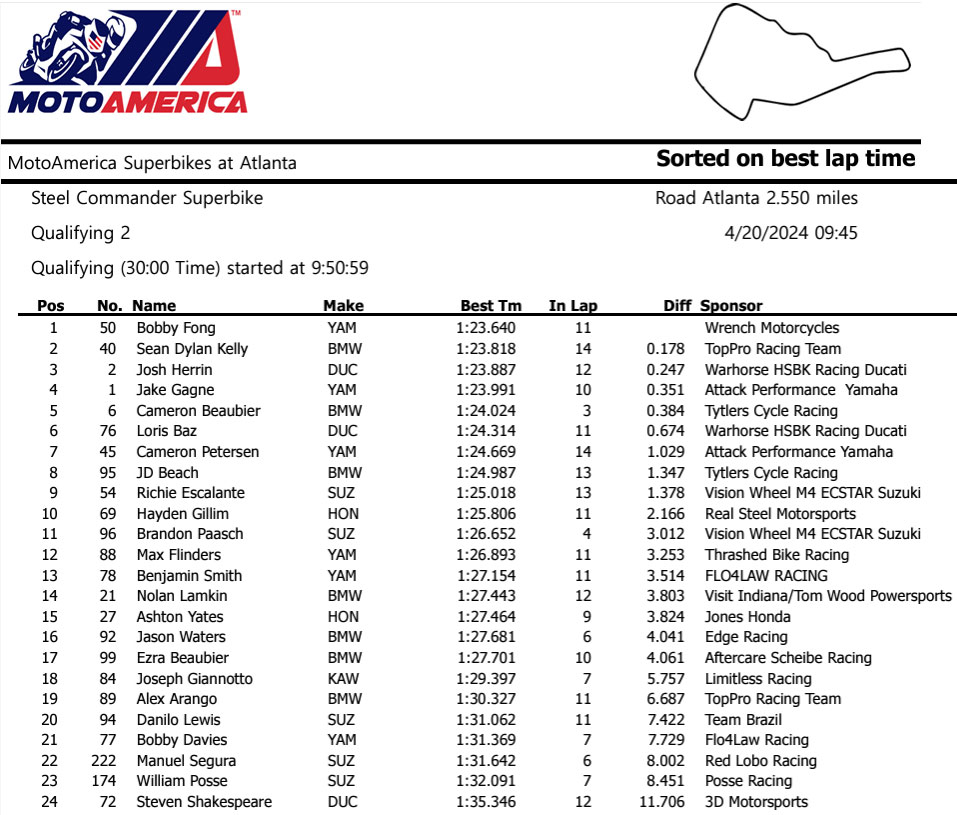 Bobby Fong a tout d’abord remporté la pole position lors de la séance matinale de la qualification 2 au guidon de sa Yamaha YZF-R1 du team Key Motorcycles, devant Sean Dylan Kelly sur la BMW M 1000 RR de TopPro Racing, le champion MotoAmerica Supersport 2021 et ex-pilote Moto2 reprenant décidément très vite ses marques sur le tracé américain.