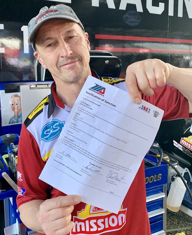 Ainsi, quand Jeremy McWilliams est sorti de la grille au départ du Challenge des King of The Baggers, une mini course sur 3 tours dotée d’une prime unique de 5000 $ pour le vainqueur, le sang de l’Irlandais du Nord de 58 ans ne fait qu’un tour, et ce ne sont ni les injonctions et la main du commissaire posée sur son carénage, ni sa position sur la bande d’herbe, qui auraient pu l’empêcher de prendre le départ de cette course limitée à six motos !