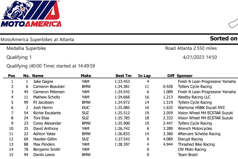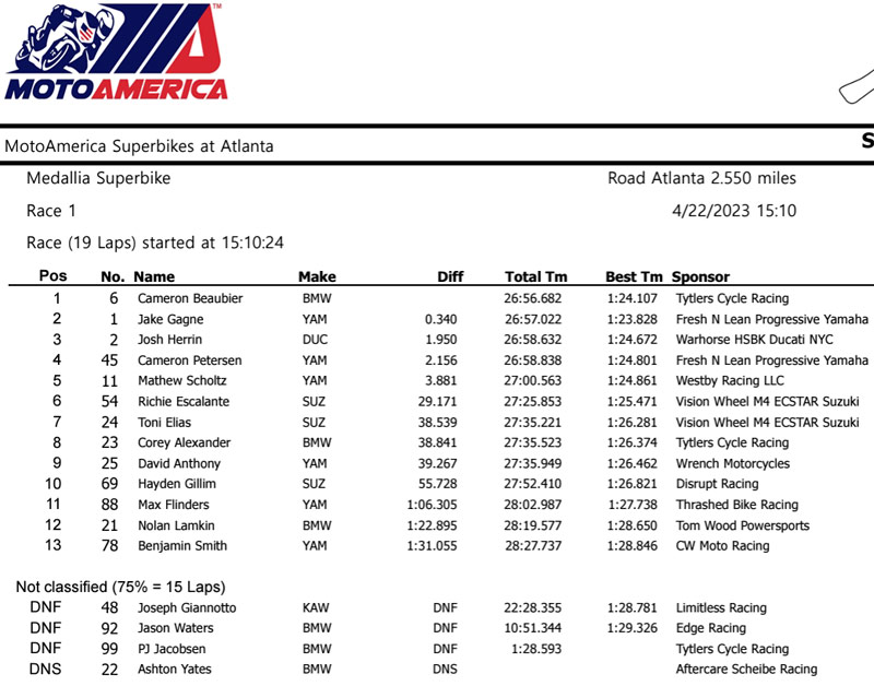 Les ténors du Superbike « made in USA » se sont retrouvés ce week-end sur le circuit de 4088 mètres de Road Atlanta, en Géorgie, aux États-Unis, à commencer par le tenant du titre Jack Gagne, toujours sur sa Yamaha R1 du Fresh N Lean Progressive Yamaha Racing.