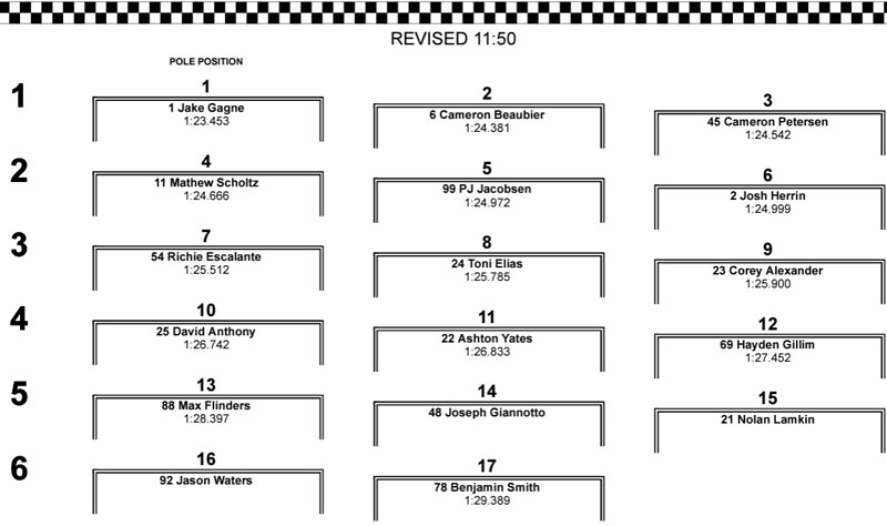 Samedi, la qualification-2 remportée par Mathew Scholtz s’avérait plus lente et c’est donc la Q1 qui déterminait la grille de départ, avec une première ligne composée de Jack Gagne, Cameron Beaubier et Cameron Petersen.