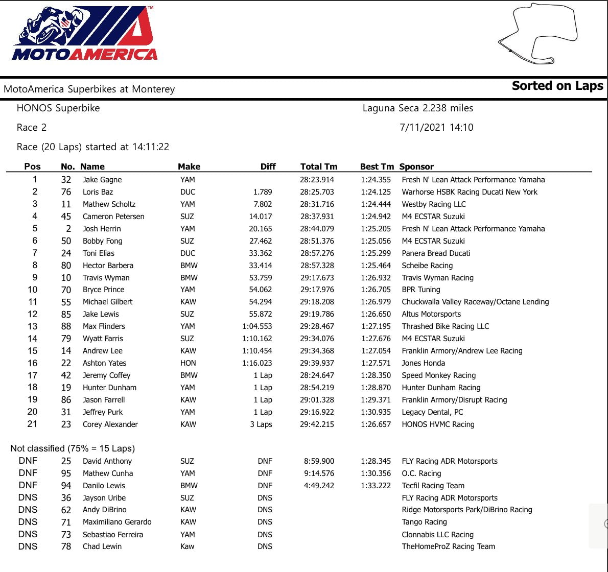 Jake Gagne:  » Dans le virage cinq, quand vous y passez avec une Superbike, vous commencez à glisser. On se rapproche du vibreur et si vous vous retrouvez sur le bord, c’est assez difficile d’en sortir. J’ai juste glissé un peu trop. Cela a été quelque chose comme ça. Je pensais que j’allais pouvoir passer, et puis le pneu arrière a glissé et, tout d’un coup, j’étais sur la terre. Mais j’ai un peu lâché l’accélérateur. La Yamaha était toujours bien accrochée sur la terre avec les slicks, alors je suis juste remonté sur le vibreur. Loris (Baz) est passé, puis Mat (Scholtz) est passé au Corkscrew. Ils ont tous les deux pris le large dans le Corkscrew, mais j’ai pu y plonger et passer à l’extérieur dans Rainey. J’ai réussi à récupérer la tête et je savais que je devais y aller. Évidemment, je regardais mon tableau et je savais que Loris était là. Je savais que Mat était là. Ils ne m’ont causé aucun problème pour partir. J’ai vu quelques 0,2, 0,3, et puis ils revenaient à un dixième, ils prenaient un dixième, ils revenaient à deux dixièmes… Donc, c’était une sorte de va-et-vient. »