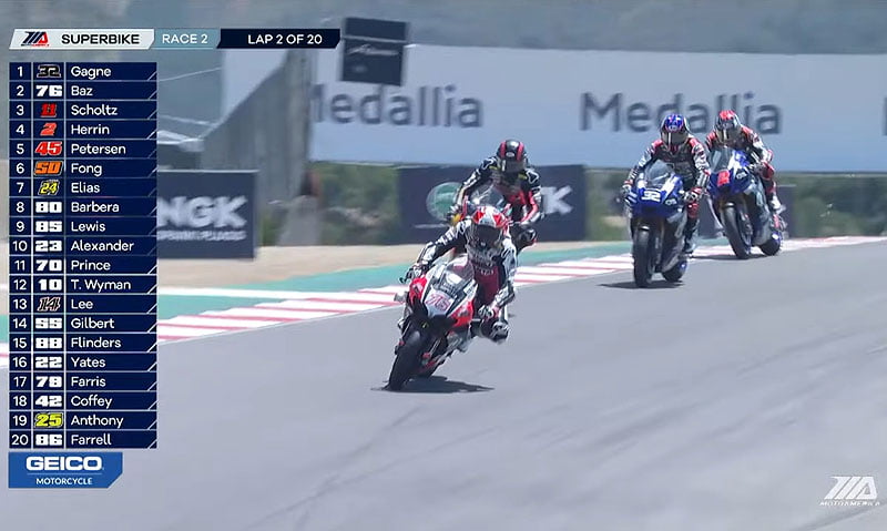 Jake Gagne:  » Dans le virage cinq, quand vous y passez avec une Superbike, vous commencez à glisser. On se rapproche du vibreur et si vous vous retrouvez sur le bord, c’est assez difficile d’en sortir. J’ai juste glissé un peu trop. Cela a été quelque chose comme ça. Je pensais que j’allais pouvoir passer, et puis le pneu arrière a glissé et, tout d’un coup, j’étais sur la terre. Mais j’ai un peu lâché l’accélérateur. La Yamaha était toujours bien accrochée sur la terre avec les slicks, alors je suis juste remonté sur le vibreur. Loris (Baz) est passé, puis Mat (Scholtz) est passé au Corkscrew. Ils ont tous les deux pris le large dans le Corkscrew, mais j’ai pu y plonger et passer à l’extérieur dans Rainey. J’ai réussi à récupérer la tête et je savais que je devais y aller. Évidemment, je regardais mon tableau et je savais que Loris était là. Je savais que Mat était là. Ils ne m’ont causé aucun problème pour partir. J’ai vu quelques 0,2, 0,3, et puis ils revenaient à un dixième, ils prenaient un dixième, ils revenaient à deux dixièmes… Donc, c’était une sorte de va-et-vient. »