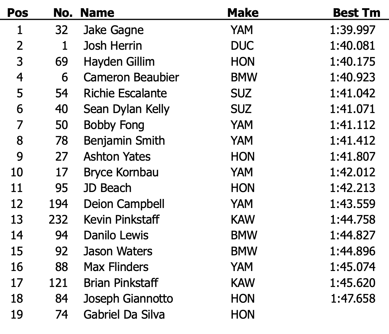 La lutte a cependant été extrêmement serrée au sommet de la hiérarchie : Josh Herrin (Warhorse HSBK Racing Ducati) n’a finalement concédé que 0,084 seconde à Gagne, tandis que Hayden Gillim (Real Steel Honda), complète la première ligne provisoire à seulement 0,094 seconde de Josh Herrin. Gagne et Herrin ont tous deux réalisé leurs meilleurs temps au septième passage.