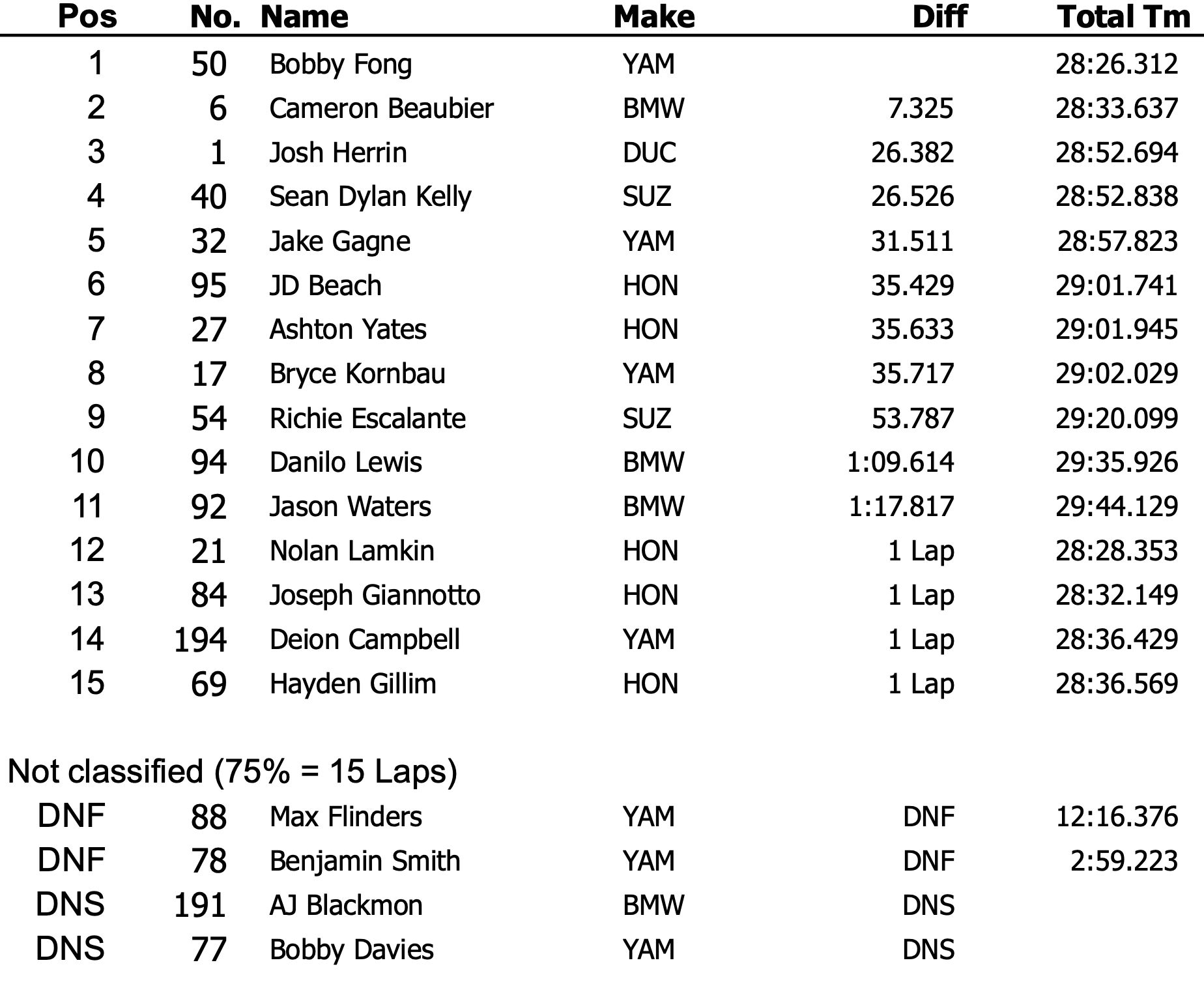 MotoAmerica, VIR : Le classement de la Course 1 :