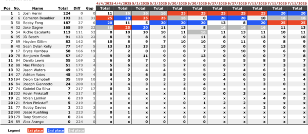 Lors de la dernière visite du MotoAmerica au VIR, Josh Herrin quittait la Virginie avec 31 points d’avance en Supersport – le même matelas dont il dispose actuellement en Superbike à la veille de ce rendez-vous crucial. Depuis le lancement de la saison 2025, Herrin n’a terminé qu’une seule fois hors du podium (5e à Road Atlanta lors de la première course), empilant cinq victoires et autant de places d’honneur (2e et 3e). Une régularité qui assoit sa place de favori pour le titre et fait de lui l’homme à battre ce week-end.