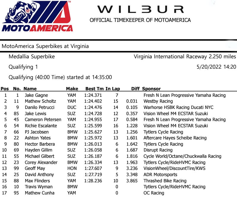 A sa tête, Danilo Petrucci (Warhorse HSBK Racing Ducati NYC) mène avec sa Panigale V4 R sur Mathew Scholtz (Westby Racing) qui pilote une Yamaha YZF-R1. Les deux hommes ont pourtant connu des mésaventures à Road Atlanta, l’Italien devant abandonner à cause d’une surchauffe moteur causée par une attente trop longue sur la grille de départ et le Sud-Africain chutant alors qu’il se battait pour la deuxième place.