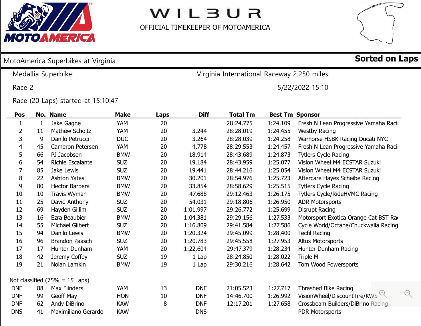 Au terme d’une deuxième course entièrement dominée par Jake Gagne (Fresh N Lean Progressive Yamaha) sur le Viriginia International Raceway d’Alton, Danilo Petrucci (Warhorse HSBK Racing Ducati NYC) a connu une effrayante mésaventure dans la course 2 du Superbike MotoAmerica au VIR.