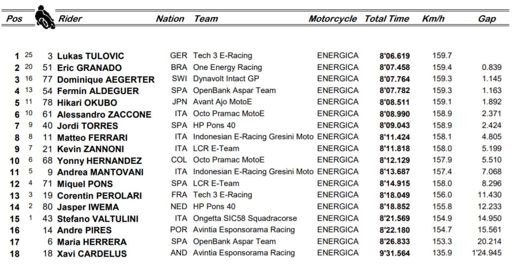 Au pied du podium on retrouve Aldeguer, qui a terminé devant Hikari Okubo ((Avant Ajo MotoE) et le leader du championnat, Alessandro Zaccone (Octo Pramac MotoE). Ce dernier voit son avance au classement général se réduire à seulement sept points sur Granado (80 contre 73 points), alors qu’un véritable quatuor de tête semble désormais se dégager, le tenant du titre Jordi Torres (Pons Racing 40) totalisant 72 unités et Aegerter 69. Le vainqueur du jour, Tulovic, pointe lui à la cinquième place avec 59 points.