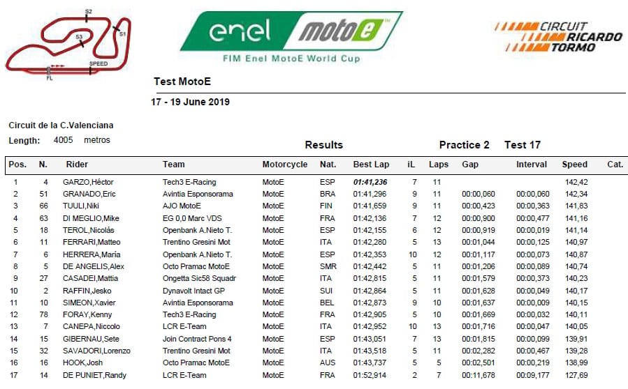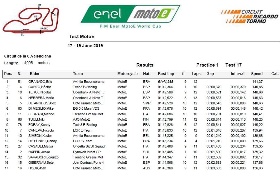 Lors de la prise en main de ce matin, Eric Granado, qui roule sous les couleurs Avintia Esponsorama Racing, s’est montré le plus rapide en 1’41.985 devant Hector Garzo (Tech3 E-Racing).
