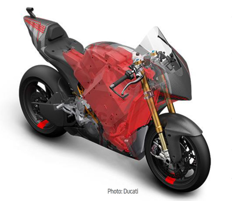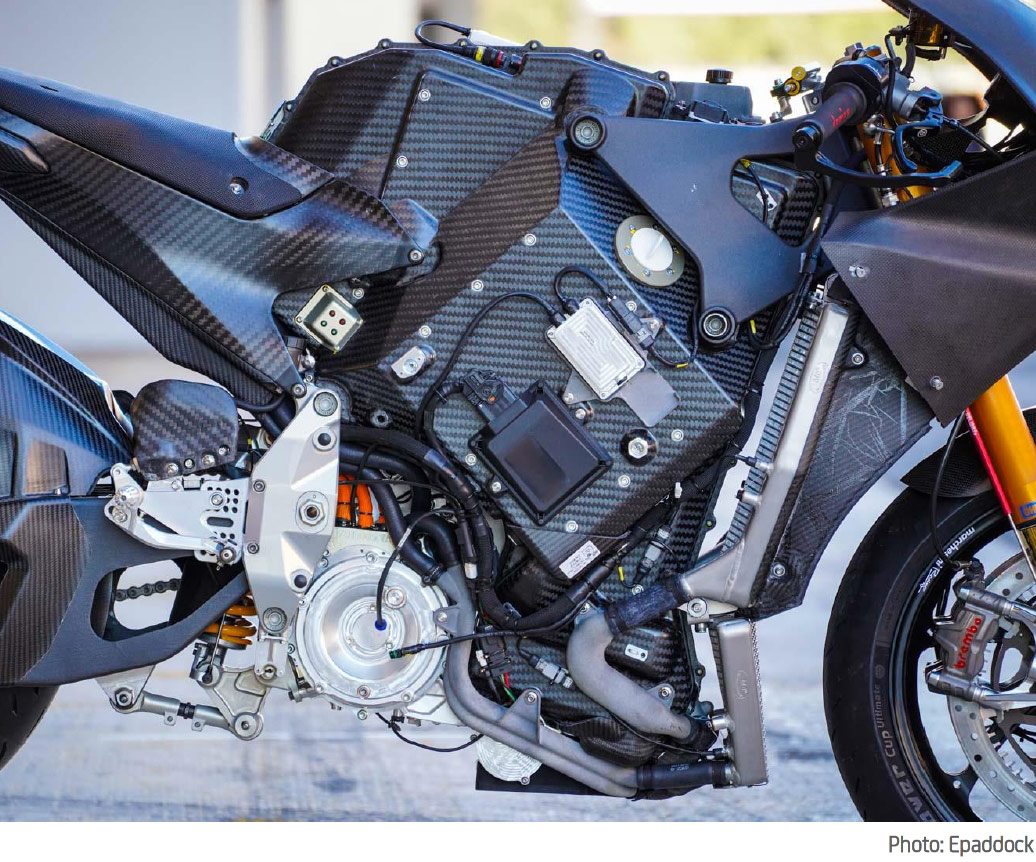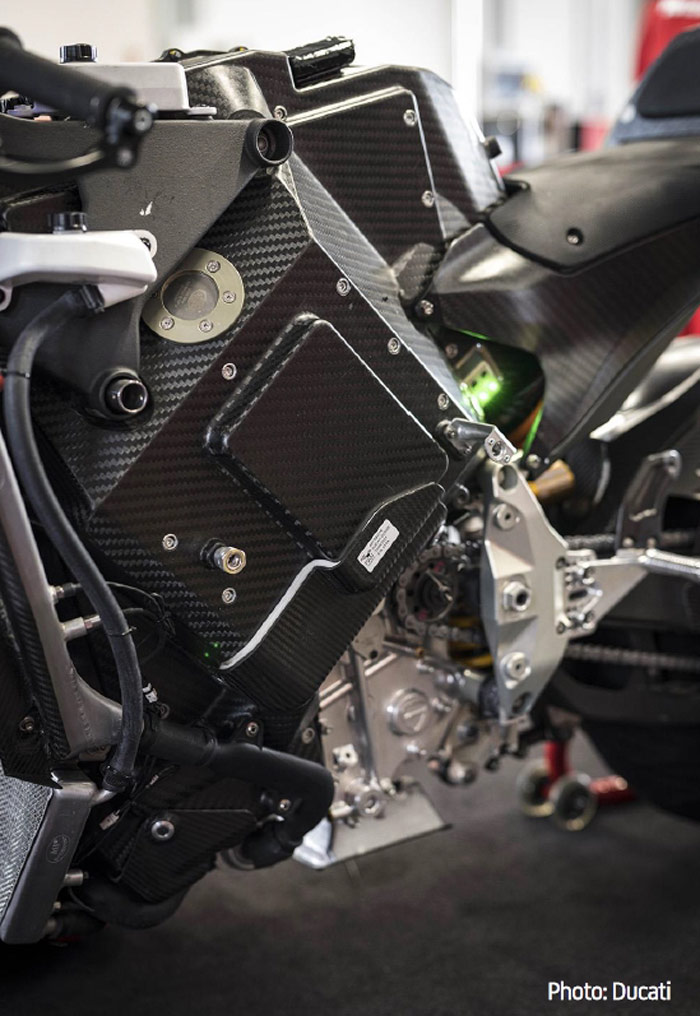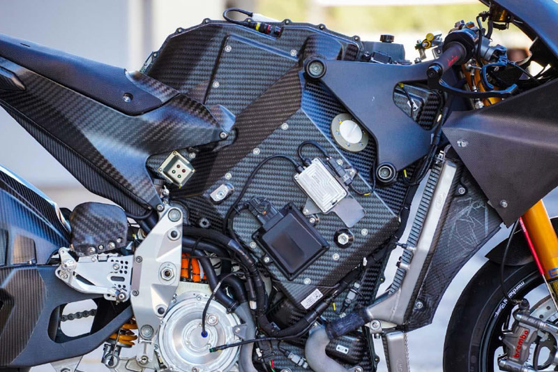 Le boîtier en fibre de carbone de la batterie agit également comme une partie du châssis, tout comme le moteur de la Panigale V4.  Cette solution permet d’économiser du poids et de l’espace.