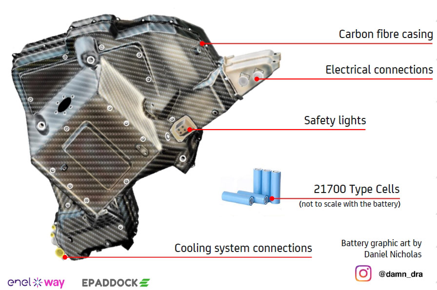 Puisque la partie la plus lourde de la moto est la batterie (110 kg), une forme élaborée de son boîtier et la distribution des cellules à l’intérieur de celui-ci a été définie pour obtenir un équilibre optimal du poids.