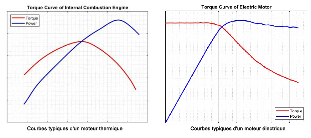 Un moteur électrique a une courbe de puissance qui augmente avec le nombre de tours pendant la majeure partie de la plage d’utilisation jusqu’à ce qu’elle se stabilise à haut régime. Pendant ce temps, la courbe de couple est