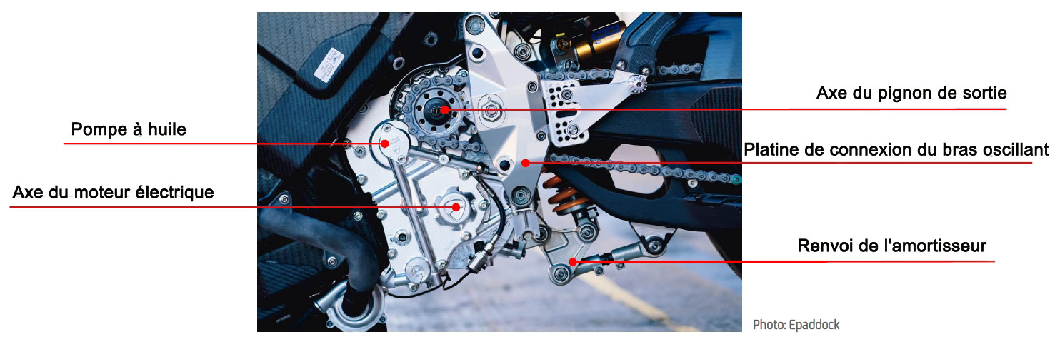 Le moteur a un rendement allant jusqu’à 97 % et fait partie intégrante du cadre de la moto; il est fixé de manière rigide à la partie inférieure du boîtier de la batterie, aux plaques du bras oscillant, et il est relié à la biellette de l’amortisseur.