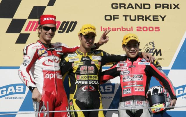 La première victoire de Mike en GP, en Turquie en 125 cm3, ici entre Mattia Pasini et Tomoyoshi Koyama.