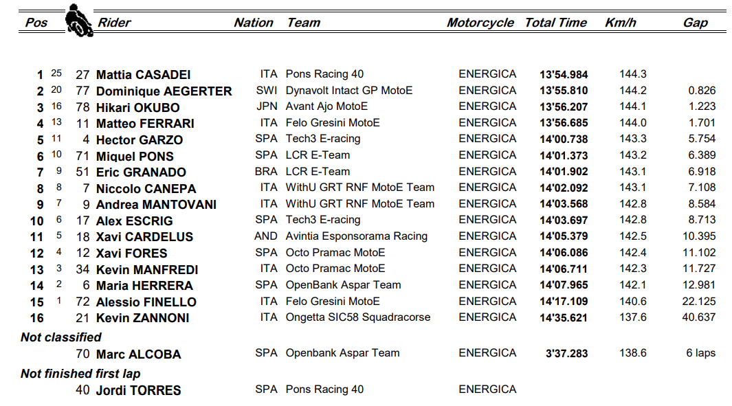 Devant, la lutte pour la victoire sur cette première course s’est résumée à un duel entre Casadei et Zannoni, le premier cité parvenant à repousser toutes les attaques de son compatriote transalpin, jusqu’à ce que ce dernier parte à la faute en perdant l’avant dans le pénultième virage et cède la deuxième place à Aegerter. Le podium de cette Course 1 était complété par Okubo, auteur d’une très bonne prestation et qui décrochait là son premier top 3 dans la catégorie.