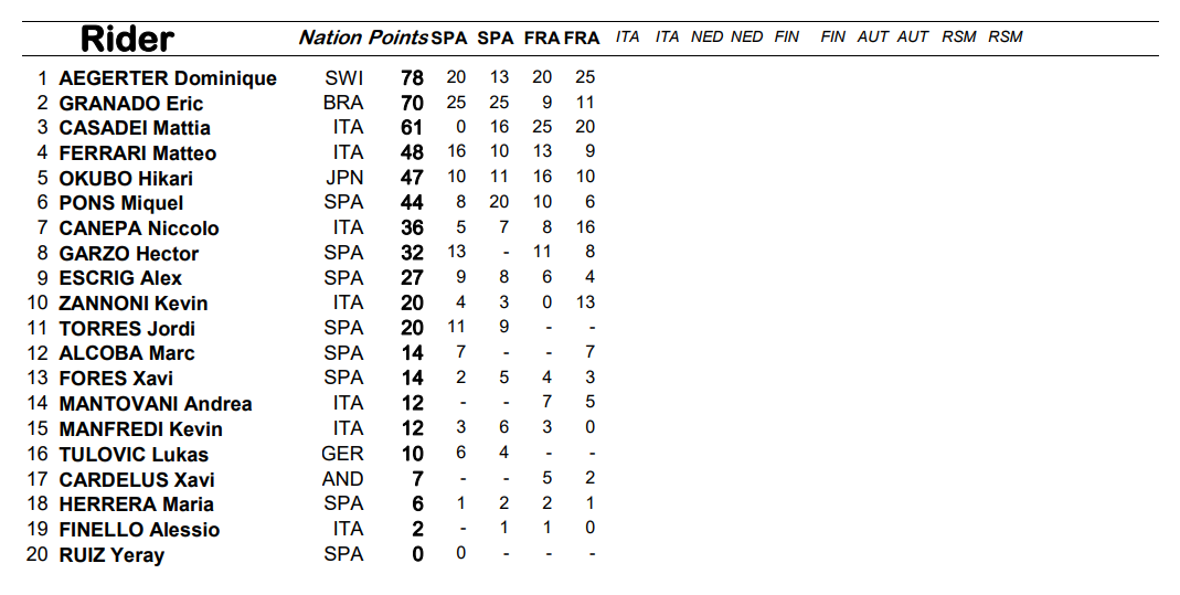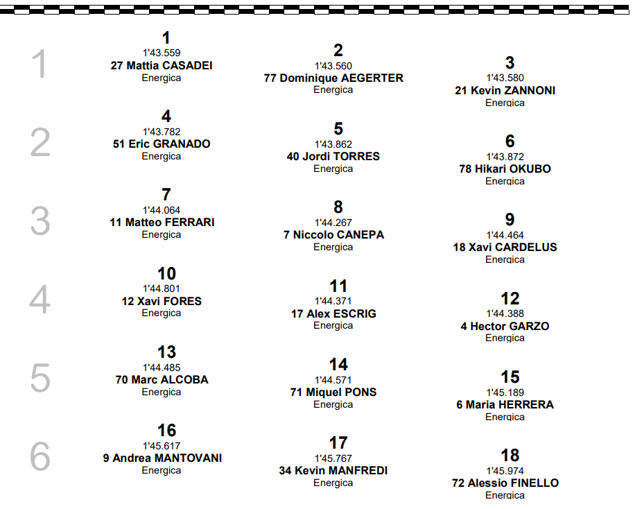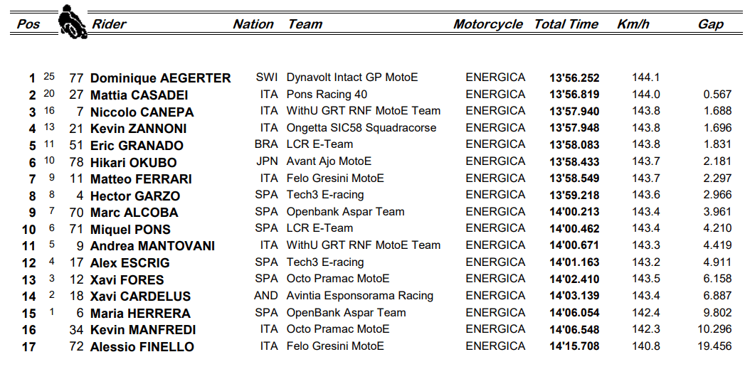 Au bout du compte, le meilleur temps à la fois au terme de la première et de la seconde partie des qualifications (une première dans la catégorie, qui a adopté ce nouveau format de qualifications, calqué sur celui du MotoGP, du Moto2 et du Moto3), et donc une E-Pole amplement méritée, obtenue par la plus petite des marges, à savoir un millième d’avance sur Aegerter ! Kevin Zannoni s’emparait quant à lui de la troisième place sur la grille, alors qu’en deuxième ligne on retrouvait Granado devant le double tenant du titre Jordi Torres et le Japonais Hikari Okubo.
