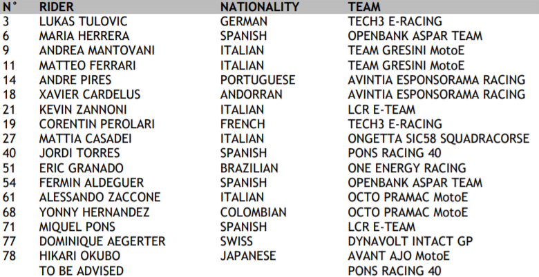 Lise des engagés en MotoE 2021 : on notera le 19 pour Corentin, un numéro lourd de sens chez Tech3 depuis OJ