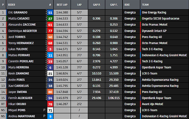Eric Granado (One Energy Racing) gagne au dernier virage en prenant le dessus sur Alessandro Zaccone (Octo Pramac MotoE). Mais le leader du MotoE termine 3ème à cause d’une pénalité, alors que la deuxième place revient à Mattia Casadei (Ongetta SIC58 Squadra Corse).