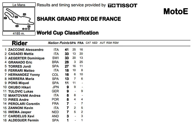 Un mot sur Lukas Tulovic (Tech3 E-Racing), longtemps 3e avant de se faire enfermer dans le dernier tour. L’Allemand marque tout de même ses premiers points, tout comme son coéquipier Corentin Perolari.