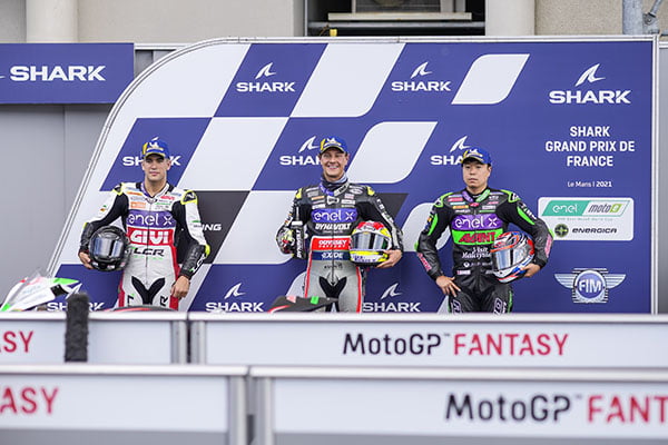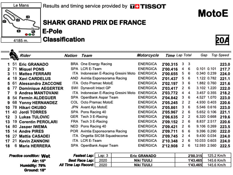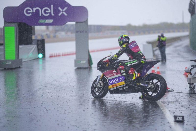 Comme mentionné, une pluie torrentielle s’est abattue sur le circuit Bugatti juste avant le début des qualifications, donc la procédure WET a été adoptée. En d’autres termes, une séance de 12 minutes a été organisée pour tous les coureurs, avec un maximum de six tours chacun, y compris le tour de sortie et de retour. Les coureurs partent à l’heure convenue, mais la pluie augmente encore plus et, en quelques secondes, le drapeau rouge apparaît et bloque tout. Lorsque la pluie diminue, les pilotes MotoE entrent en piste, avec la procédure de qualification expliquée ci-dessus.
