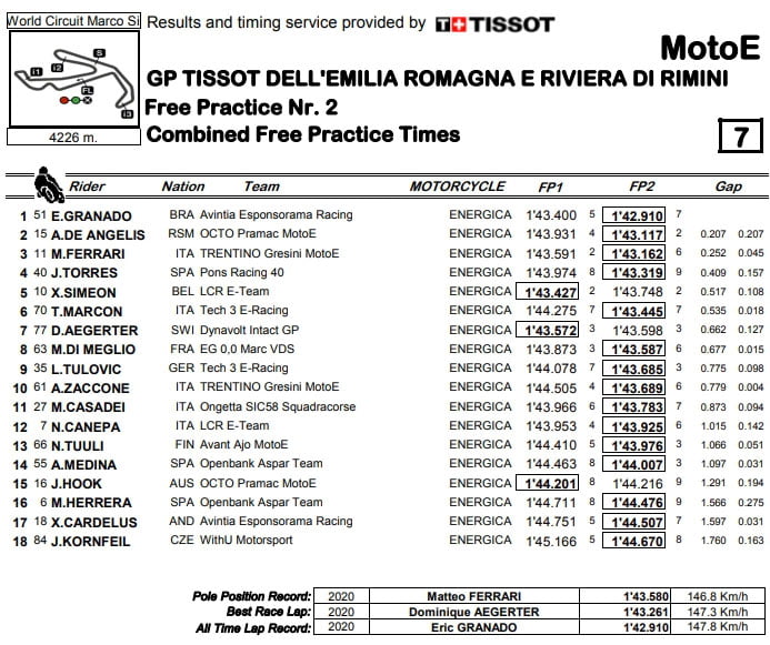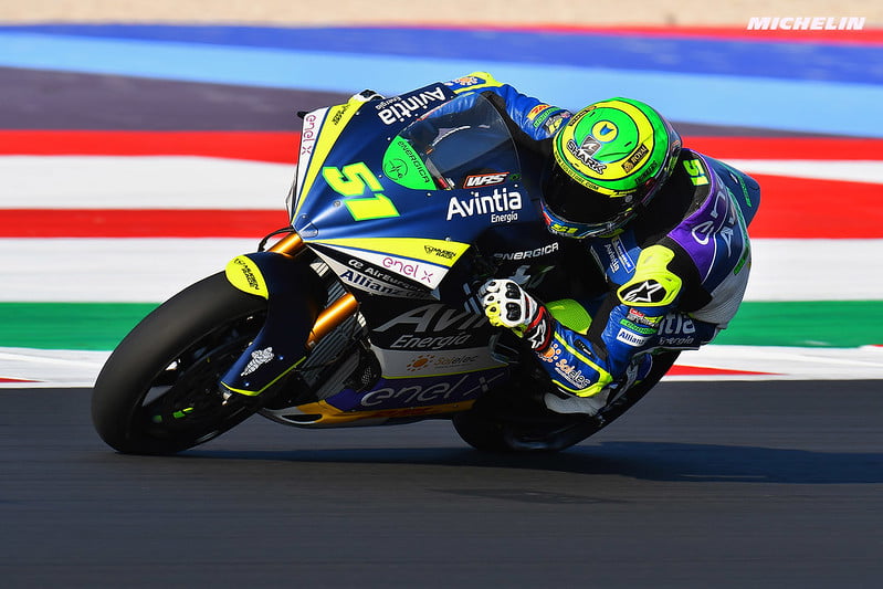 Eric Granado (Avintia Esponsorama Racing) a été l’homme à battre lors de la première journée de la Coupe du monde Enel FIM MotoE™ au Gran Premio TISSOT dell’Emilia Romagna e della Riviera di Rimini, en établissant un nouveau record du tour en 1’42.910. Son plus proche adversaire a été le héros local de Saint-Marin, Alex de Angelis (Octo Pramac MotoE), avec deux dixièmes de retard, puis le triple vainqueur de Misano Matteo Ferrari (Trentino Gresini MotoE), troisième au classement général.