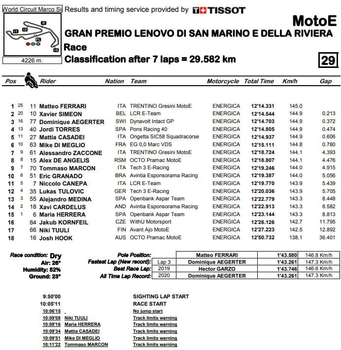 Ce sont donc trois victoires en deux ans à domicile pour le vainqueur en titre de la Coupe du monde, et c’est aussi sa première victoire de 2020, ce qui le remet dans la course pour la Coupe. Xavier Siméon (LCR E-Team) et Dominique Aegerter (Dynavolt Intact GP) complètent le podium à l’issue d’une autre rencontre très serrée en MotoE™.
