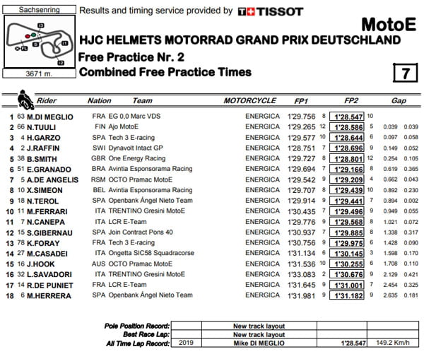 A la reprise, Mike Di Meglio (EG 0.0 Marc VDS), équipé d’un pneu arrière neuf, s’est adjugé le meilleur temps devant Niki Tuuli (FIN, Ajo Motorsport MotoE), Héctor Garzó (E, Tech3 E-Racing), Jesko Raffin (GP Dynavolt Intact) et Bradley Smith (One Energy Racing).
