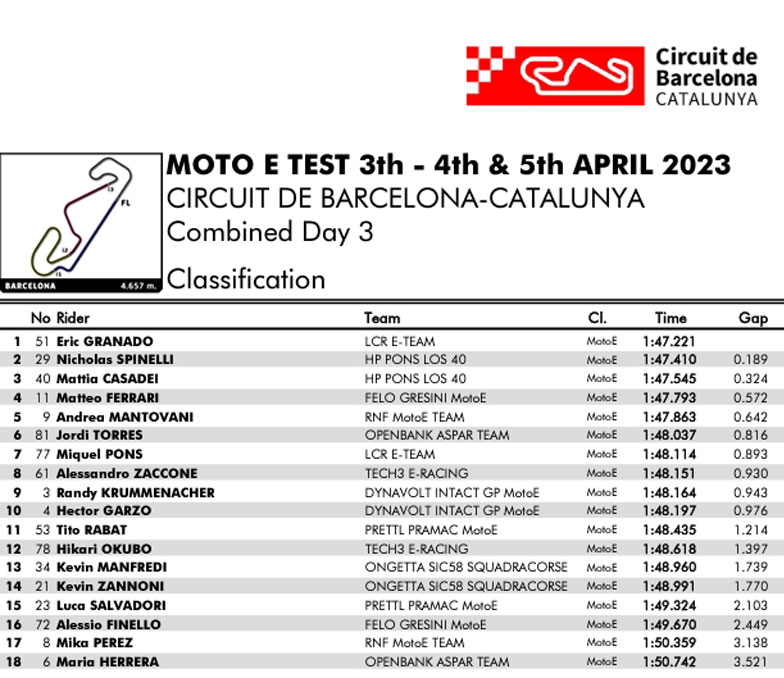 Lundi, sur la nouvelle Ducati V21L, Eric Granado (LCR E-Team) inscrivait le meilleur temps en 1’48.243, juste devant Matteo Ferrari (Felo Gresini MotoE™), alors que seul manquait à l’appel Jordi Torres (Openbank Aspar Team) parti remplacer Izan Guevara (Solunion GASGAS Aspar Team) en Moto2 en Argentine.