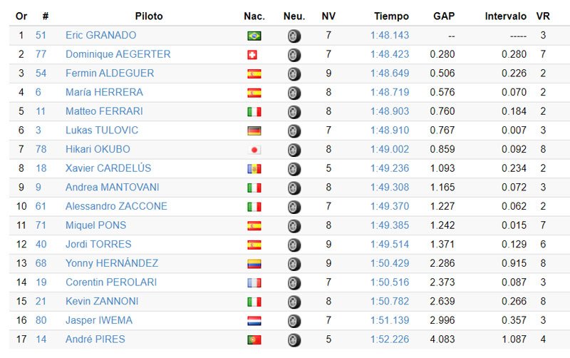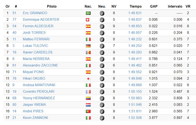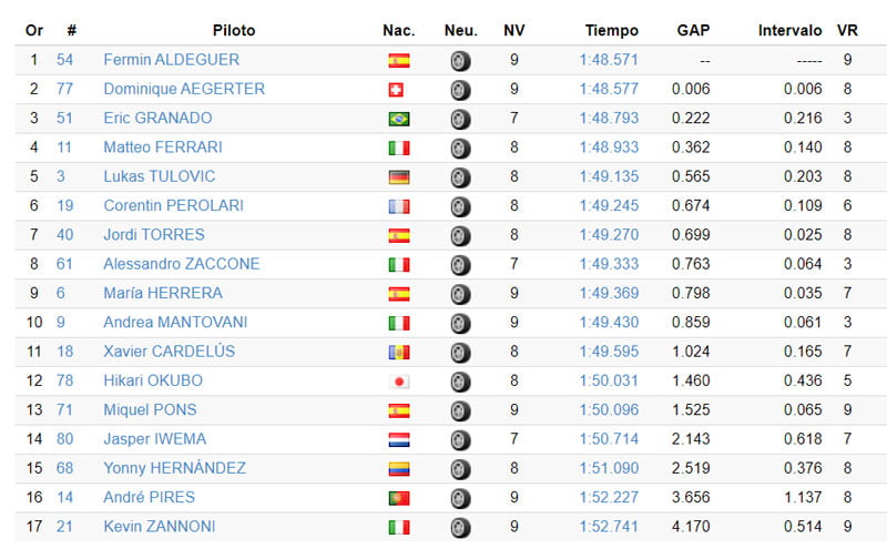 La première session de l’après-midi, entre 13h00 et 13h30, a été un peu plus lente en termes de références de temps. Cependant, les trois premiers du classement sont beaucoup plus proches, avec seulement 22 millièmes de seconde entre eux. En tête on retrouve Eric Granado (One Energy Racing), avec 6 millièmes d’avance sur Dominique Aegerter (Intact GP), avec quelques problèmes techniques, tandis que le rookie Fermín Aldeguer (Aspar Team), qui continue à être un protagoniste, occupe la troisième place. Juste derrière se trouvent les deux champions des années précédentes de la catégorie, Jordi Torres (Pons Racing) et Matteo Ferrari (Team Gresini).