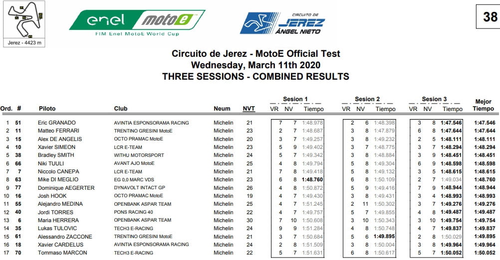 Eric Granado, le pilote brésilien de l’équipe Avintia Esponsorama, a dominé le classement final pour la deuxième journée, établissant un temps record de 1’47.546 dans la troisième et dernière session de la journée. Le deuxième meilleur temps de la journée a été établi par Matteo Ferrari (Trentino Gresini MotoE) en 1’47.644 après avoir été le plus rapide lors des deux premières sessions, tandis que le troisième meilleur temps de la journée a été établi par Alex de Angelis (Octo Pramac) en 1’48.111.