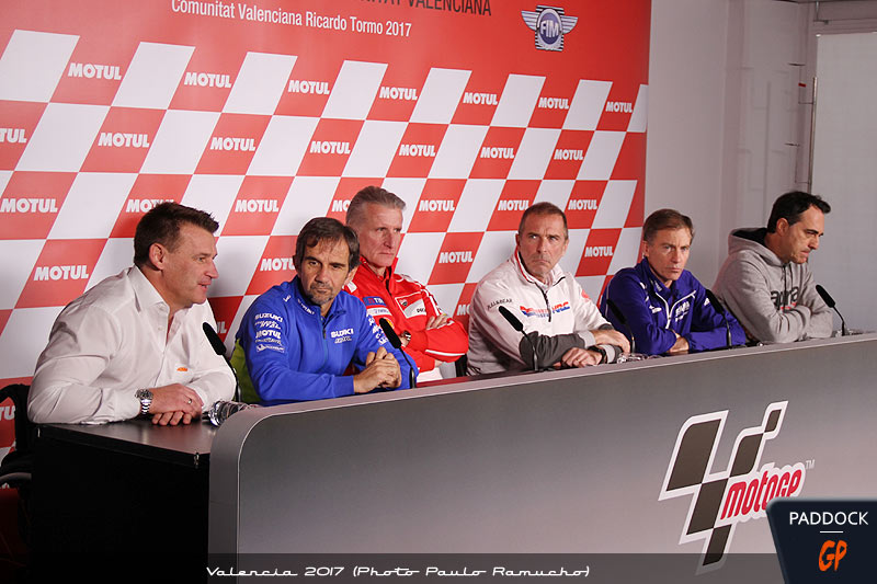 Étaient présents Livio Suppo (Repsol Honda team Principal), Paolo Ciabatti (Ducati MotoGP Project Director), Lin Jarvis (Yamaha Motor Racing Manager Director), Davide Brivio (Suzuki Team Manager), Romano Albesiano (Technical and Sporting Aprilia Racing Manager) et Pit Beirer (KTM Motorsport Director).