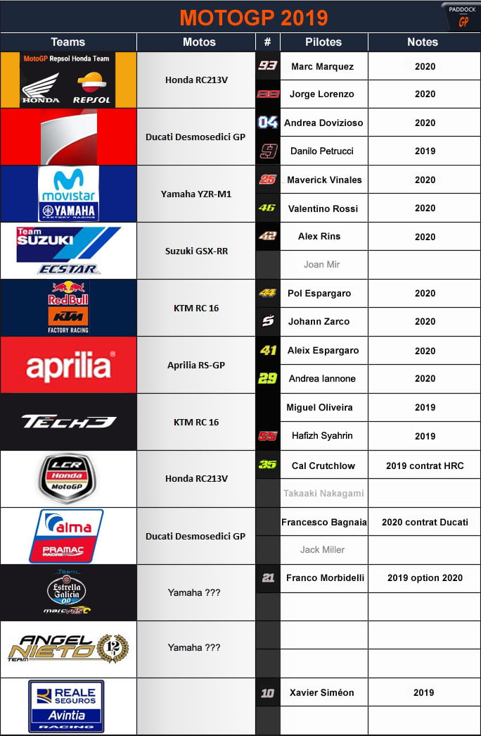 Note : Si aucune annonce officielle n’a encore été faite, le renouvellement du contrat de Jack Miller chez Pramac Racing semble assuré, et l’annonce de l’arrivée de Joan Mir chez Suzuki apparaît de plus en plus vraisemblable.