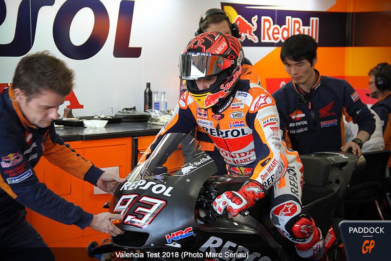 Pour ces premiers tests MotoGP de la saison 2019 qui se déroulaient à Valence, Marc Márquez disposait de 3 RC213V pour tester des évolutions aussi bien dans le domaine du moteur qu’au niveau du châssis.