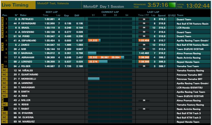 Mais heureusement, le Français a su redresser la situation. La première référence a été de son fait en 1’40.822, avec des gommes pluie. Puis avec des slicks, il est descendu en 1’34.547. C’est Petrucci qui s’est ensuite chargé de donner le ton, en combinaison rouge. Joan Mir, Francesco Bagnaia ont découvert officiellement leur nouveau jouet. Pol Espargaró, Andrea Dovizioso, Jorge Lorenzo et les testeurs Michele Pirro et Stefan Bradl ont tourné. Mention spéciale pour Jonas Folger qui vit son premier jour en tant que nouveau testeur Yamaha.