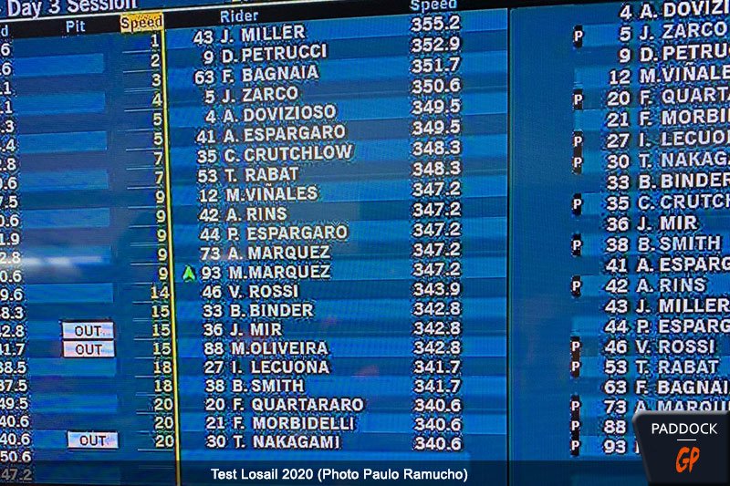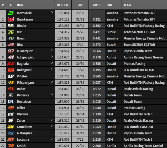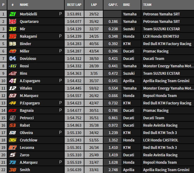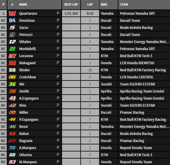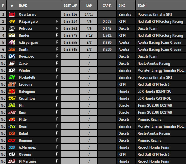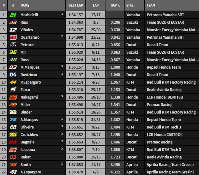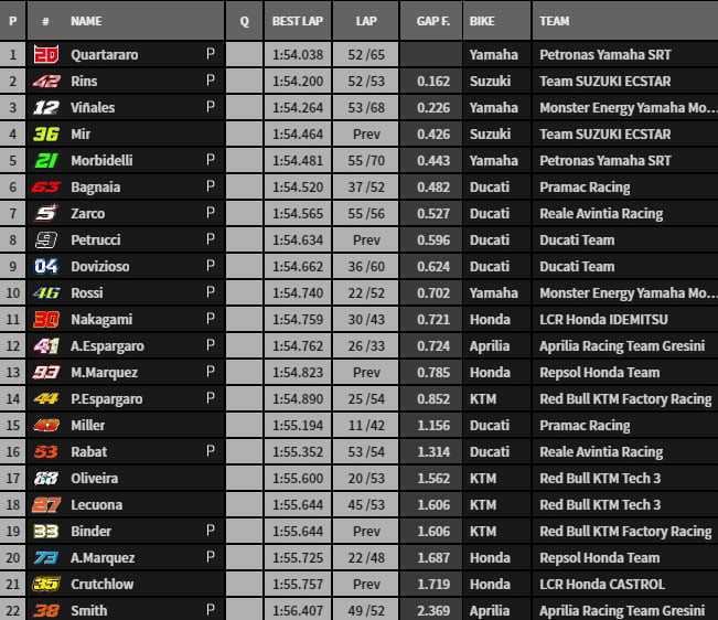 Pendant ce temps-là, Álex Rins détrône Fabio Quartararo de la deuxième position provisoire alors que Maverick Viñales bondit de la 12e à la première place en réalisant le meilleur temps de ces trois jours d’essais, en 1’53.875 puis 1’53.858. Le pilote Yamaha améliore encore les trois partiels suivants mais préfère ne pas concrétiser et rentre à son box.