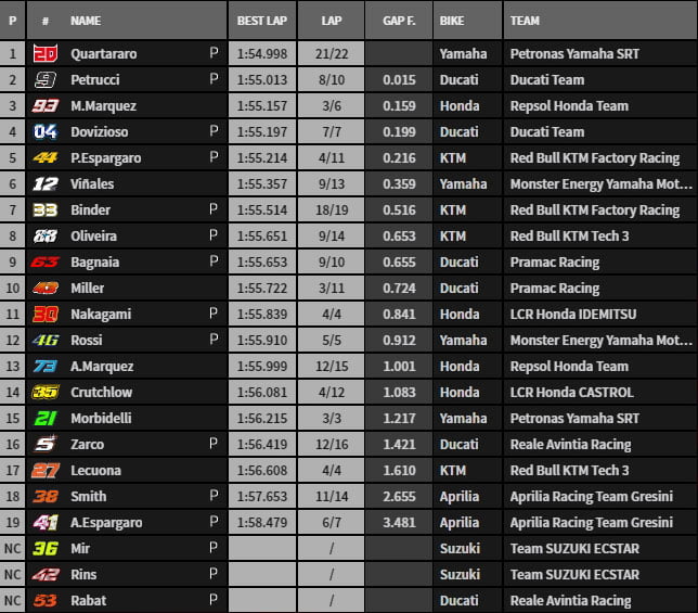 Au final, seuls Fabio Quartararo, Johann Zarco et Danilo Petrucci n’ont pas amélioré aujourd’hui.