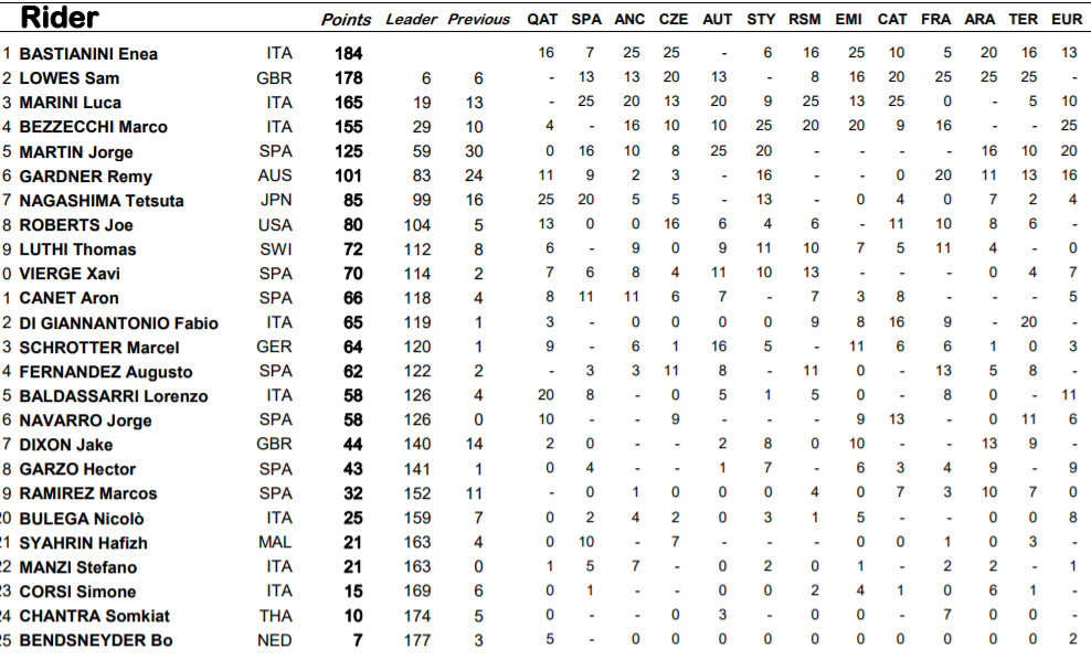 Alors, pour évacuer ce dilemme, il rappelle sa position actuelle au championnat Moto2 : « vingt-neuf points, c’est beaucoup mais je n’abandonne pas. J’y crois toujours même si c’est difficile. Mais jusqu’à ce que les maths me condamnent, j’essaye ». On rappellera que Bezzecchi serait dans une posture encore plus favorable s’il n’avait pas chuté en Aragon alors qu’il menait la course. Cela étant dit, on pourrait dire de même de Sam Lowes qui tombé au Grand Prix d’Europe…