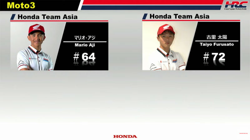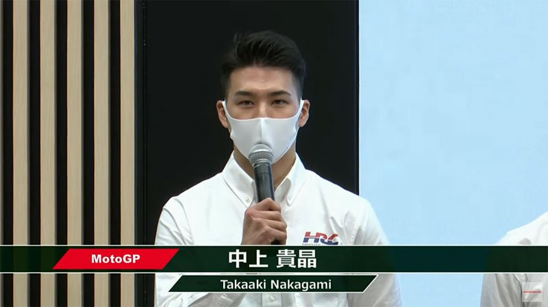 Takaaki Nakagami: » bonjour, je suis Takaaki Nakagami en MotoGP. Merci beaucoup d’assister aujourd’hui à cet événement. Je voudrais également remercier tous ceux qui regardent sur Internet. C’est ma 5e année en MotoGP et je continue à travailler pour obtenir ma première victoire. Je continuerai à travailler sérieusement pour l’obtenir: c’est un objectif très difficile mais excitant. »