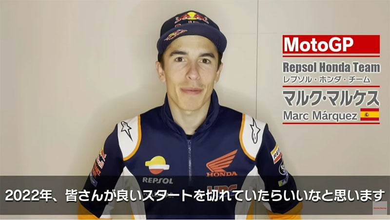 Malgré ce qui avait été annoncé, Marc Marquez est finalement apparu en vidéo pour déclarer: » bonjour à tous et avant tout bonne année ! J’espère que tout le monde a bien débuté 2022. Bien sûr, en tant que pilote, nous espérons une meilleure année 2022 car 2021 a été particulièrement dure, de retour de ma blessure au bras. Cela a été difficile, avec des hauts et des bas, mais nous avons réalisé quatre importants podiums et trois victoires. Mais malheureusement, alors que nous étions dans la meilleure période, nous avons subi une nouvelle blessure oculaire, une diplopie, et nous n’avons malheureusement pas terminée la saison d’une bonne manière. Je me sens mieux, et peu à peu il semble que le moment de recommencer à piloter une moto se rapproche, mais nous devons encore être patient car c’est un processus lent. Mais oui, je suis entièrement motivé pour 2022 et je souhaite le meilleur à tous les pilotes Honda. Bye bye ! »