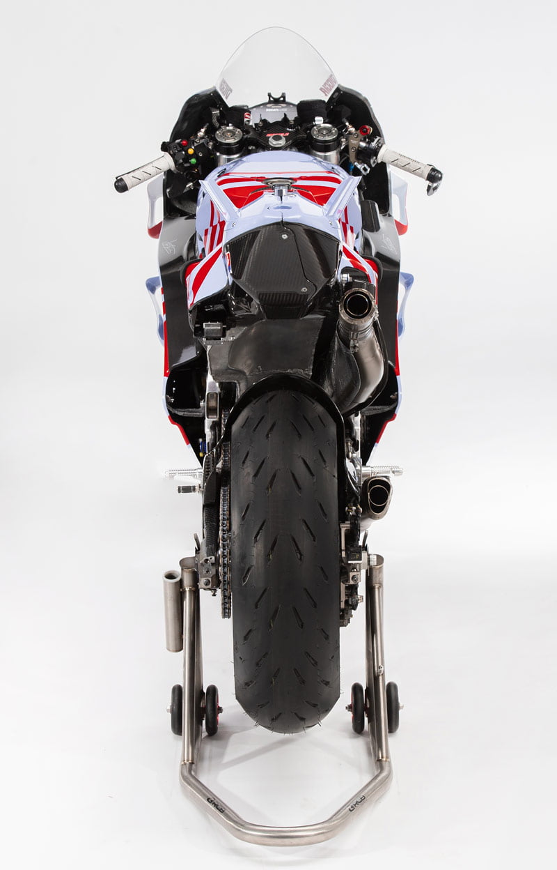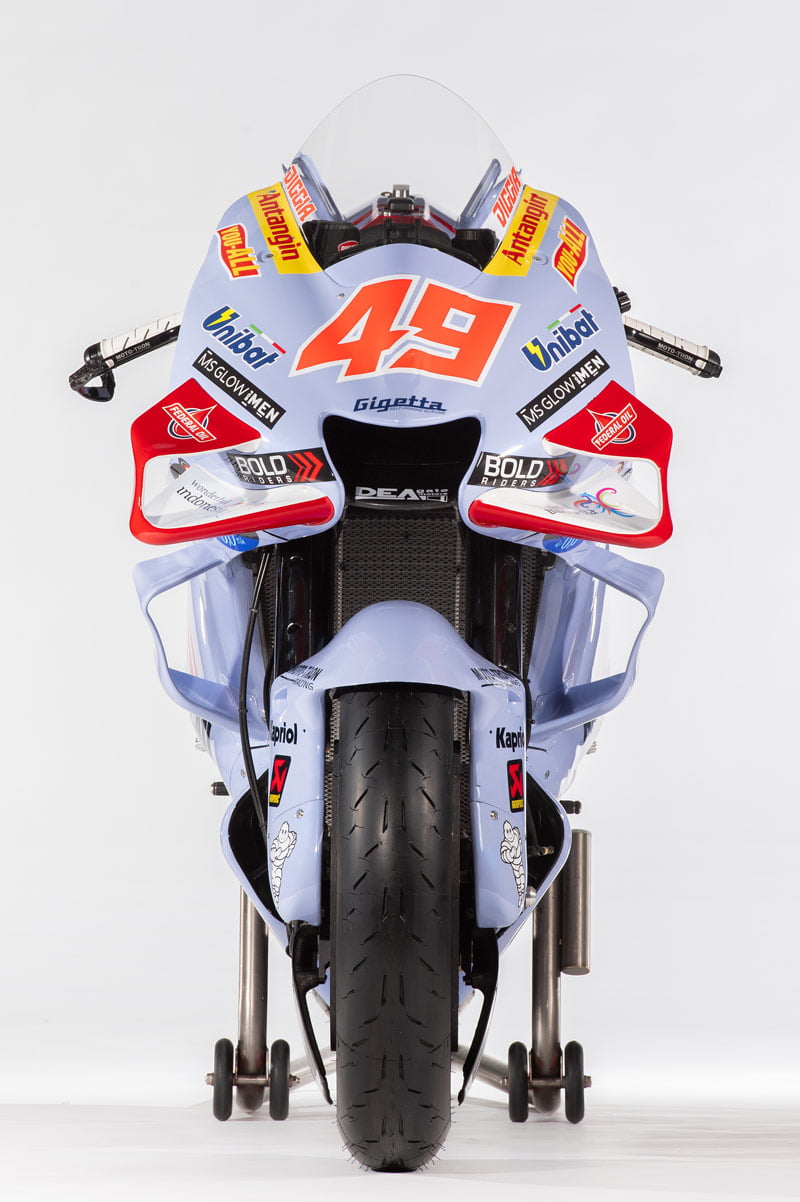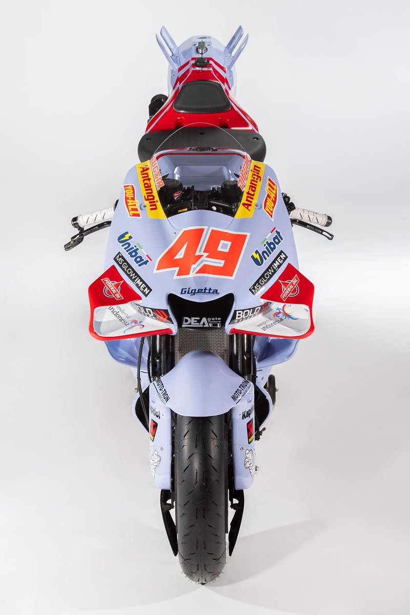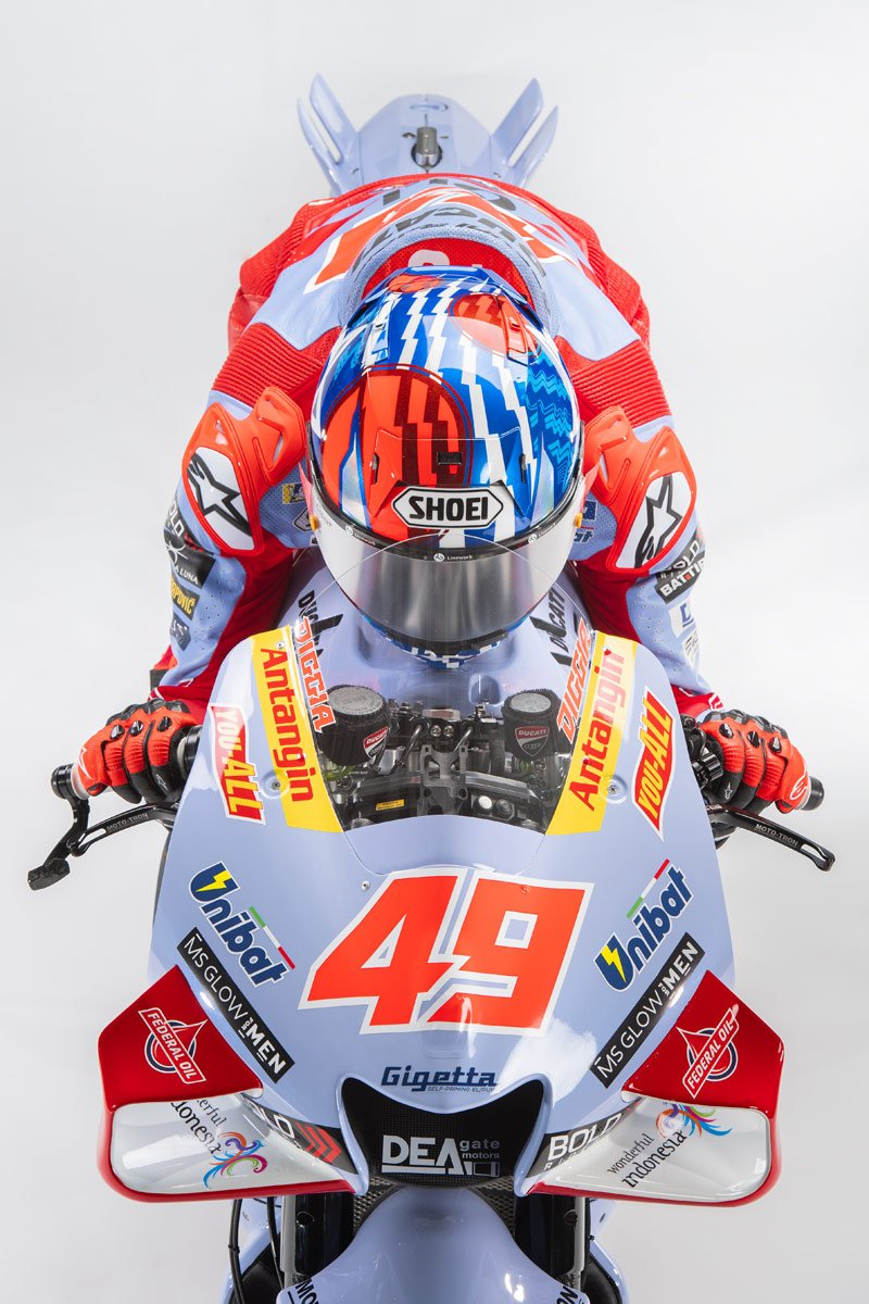 Le bleu ciel du team italien se teinte maintenant légèrement de nacre et le rouge Ducati se dynamise par des rayures que l’on retrouve également sur les combinaisons des pilotes : Joli !