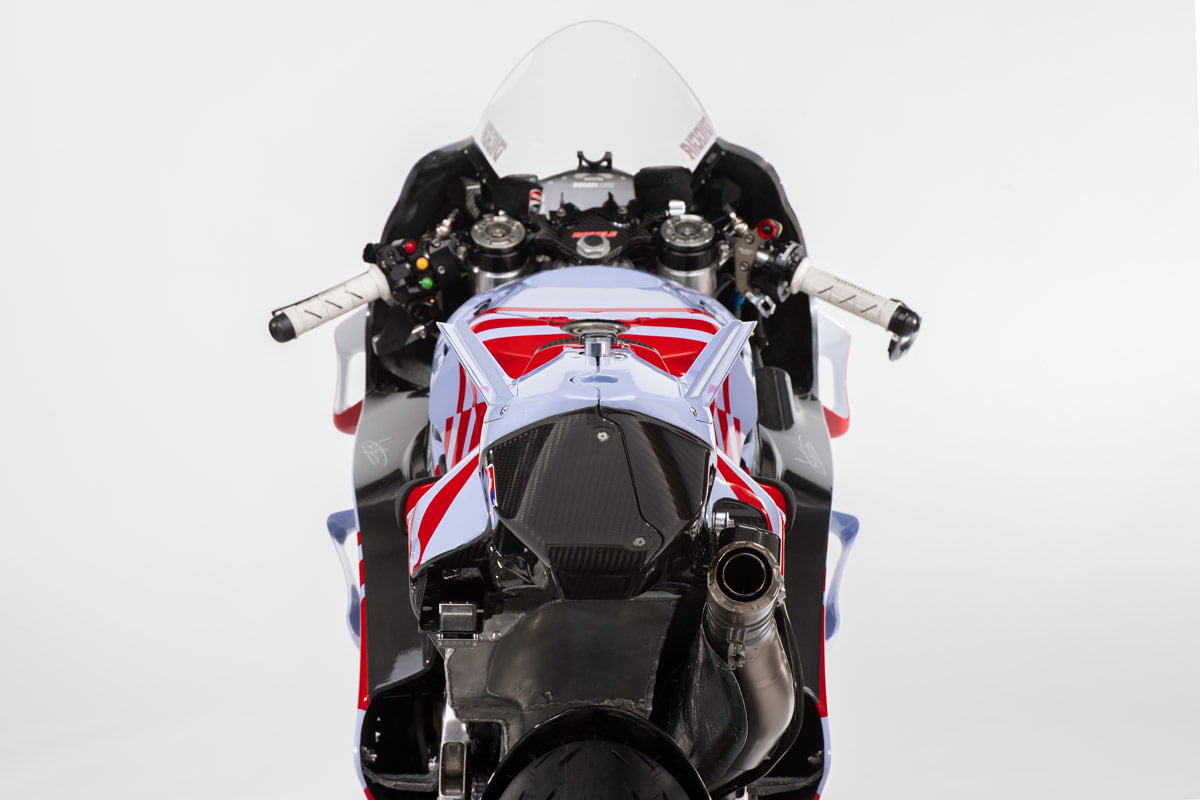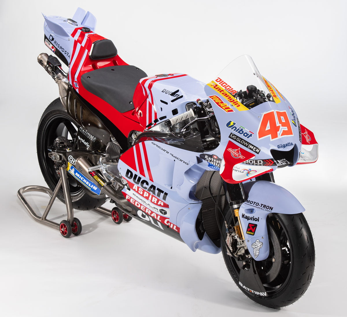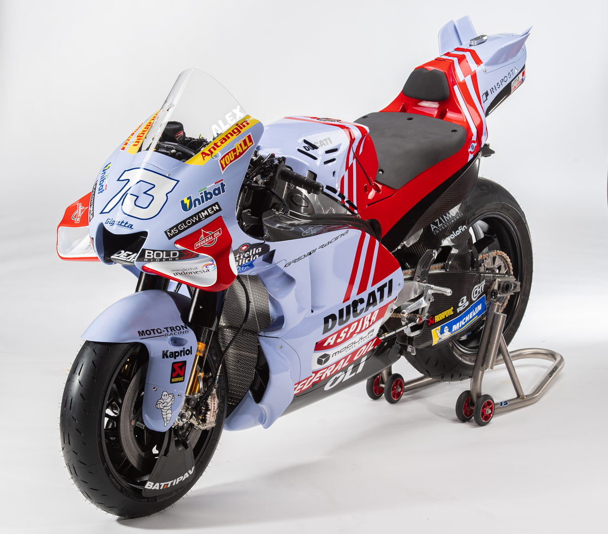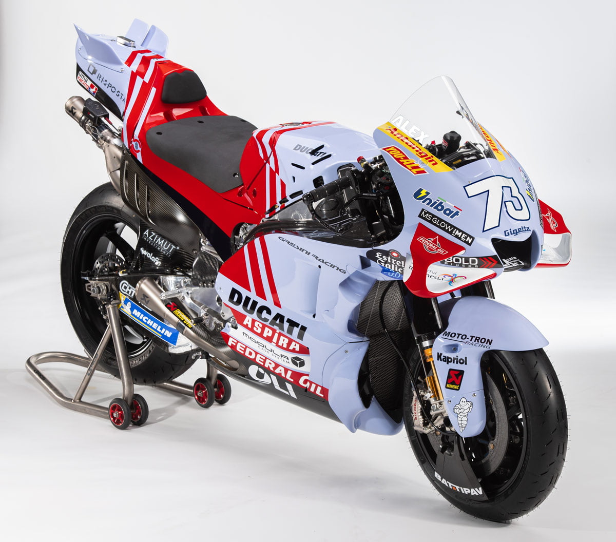 Le bleu ciel du team italien se teinte maintenant légèrement de nacre et le rouge Ducati se dynamise par des rayures que l’on retrouve également sur les combinaisons des pilotes : Joli !
