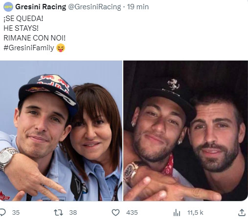 Une photo d’Alex Marquez et Nadia Padovani, un texte indiquant « Il reste ! Il reste avec nous ! » et une photo des footballeurs Pique et Neymar, 10 jours avant son départ de Barcelone…