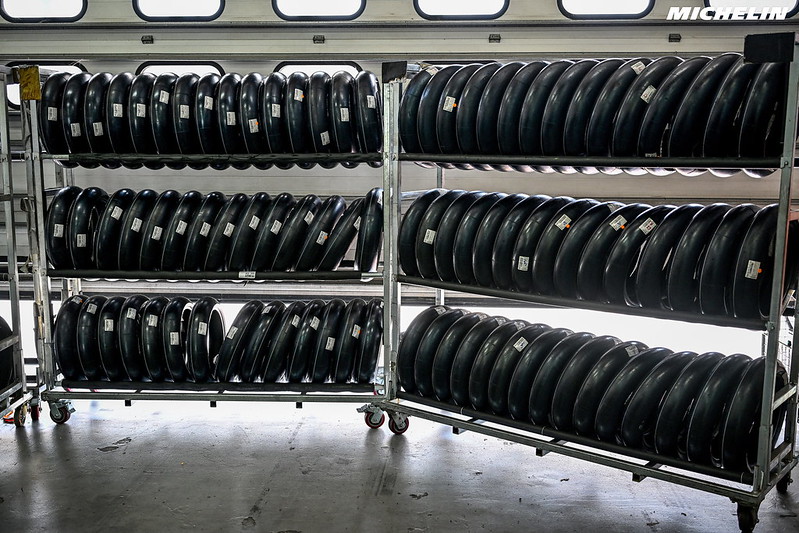Pneu arrière : Là aussi Michelin a fait appel à de nouvelles technologies, toujours plus innovantes aussi bien au niveau des composants que de la technique de « mélangeage ». L’objectif est d’obtenir une plus grande constance des performances, et d’amoindrir le phénomène d’usure au fil des tours. Les mélanges de gomme des roues avant et arrière ont des compositions et des méthodes de fabrication différentes.