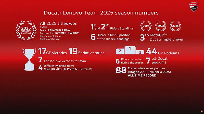 En 2025, Ducati a réalisé le Grand Chelem, en remportant les titres pilote, constructeur et team.